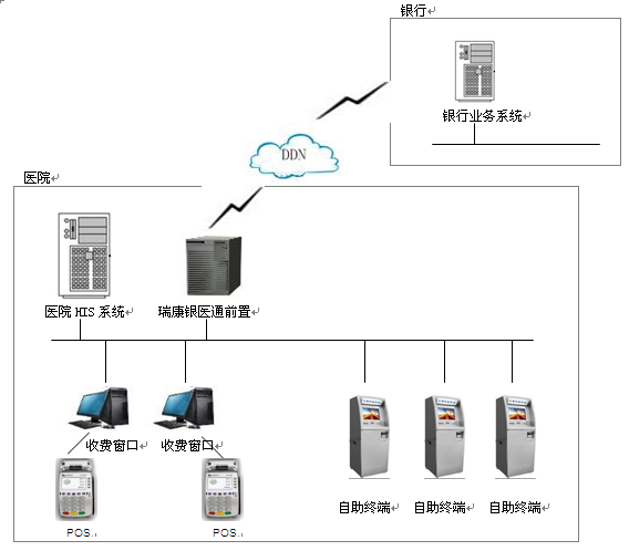 為了滿足各大醫(yī)院日益增長的繳費需求,緩解醫(yī)院排隊繳費困境,南京瑞康資訊有限公司提出銀醫(yī)通系統(tǒng)的解決方案,在本方案中銀醫(yī)通包括兩個部分,一部分是窗口銀行卡收費,一部分是自助終端銀行卡支付。